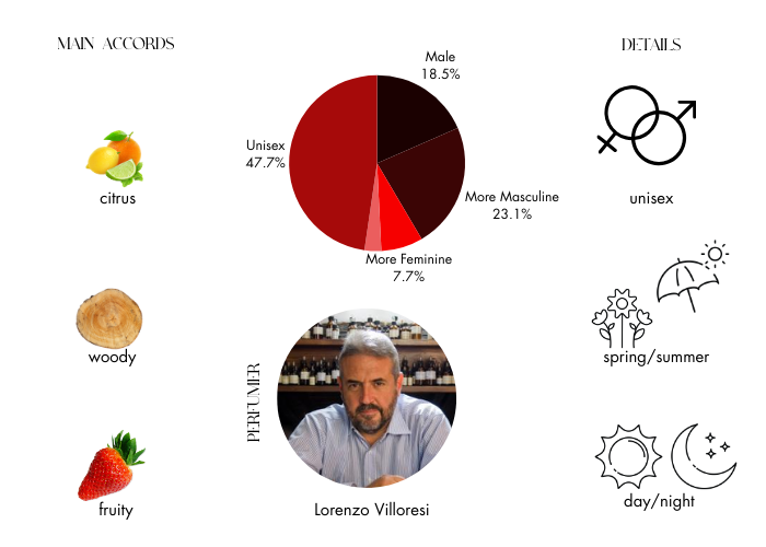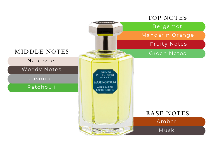 Top note: Fresh, green, citrus with Bergamot notes and Mandarin and soft floral and fruity touches. Middle note : Fresh, floral with aromatic woods nuances, Narcissus, Patchouli, Jasmin. Base note: Fresh citrus floral, with soft ambery, musky and woody touches.