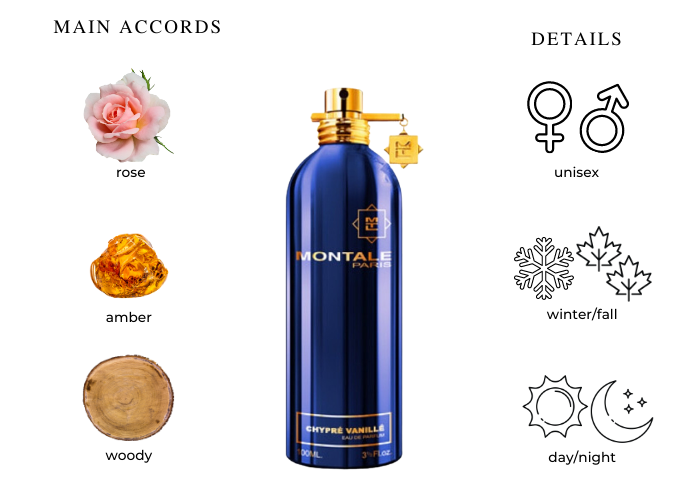 Chypré Vanillé is a shared / unisex perfume by Montale. The scent was launched in 2006 and the fragrance was created by perfumer Pierre Montale. Chypré Vanillé fragrance notes: Tibetan rock rose, Vanilla, Amber, Incense, Sandalwood, Vetiver, Tonka bean
