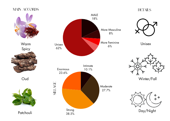 With each spray, Spicy Aoud unveils a harmonious blend of orange, saffron and patchouli, enticing your senses with their rich and aromatic embrace. As the fragrance settles on your skin, the captivating presence of musk takes center stage, evoking a sense of confidence and allure that is truly irresistible.