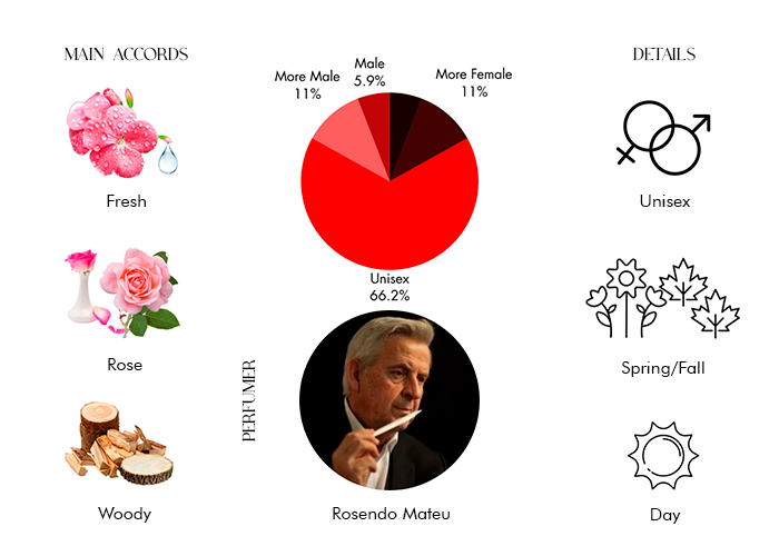 - Middle Notes: Aromatic Notes, Rose, Spices and Tuberose