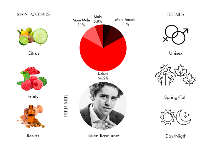 - HEART Notes : Raspberry, Tunisian Orange Flower, Olibanum Resinoid.