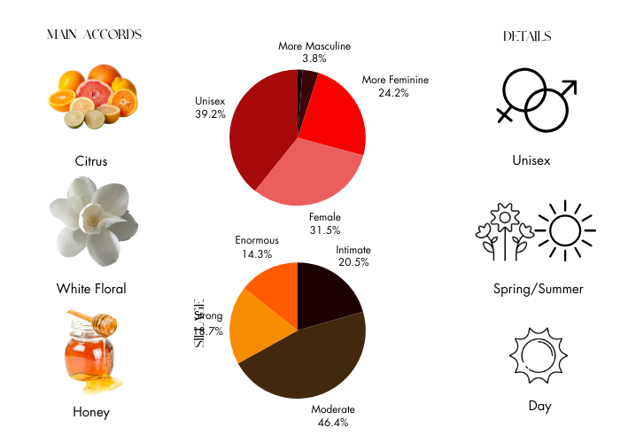 - Base notes: Black locust Honey, Ambrette, Civet, Vanilla, Tolu Balsam and Labdanum