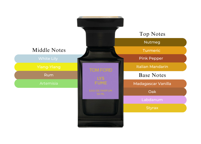 Fragrance notes are Mandarin, Pink pepper,Nutmeg, Turmeric, White lily, Ylang-ylang, Davana,West Indian Demerera rum essence, Vanilla, Labdanum, Styrax, and Oakwood.