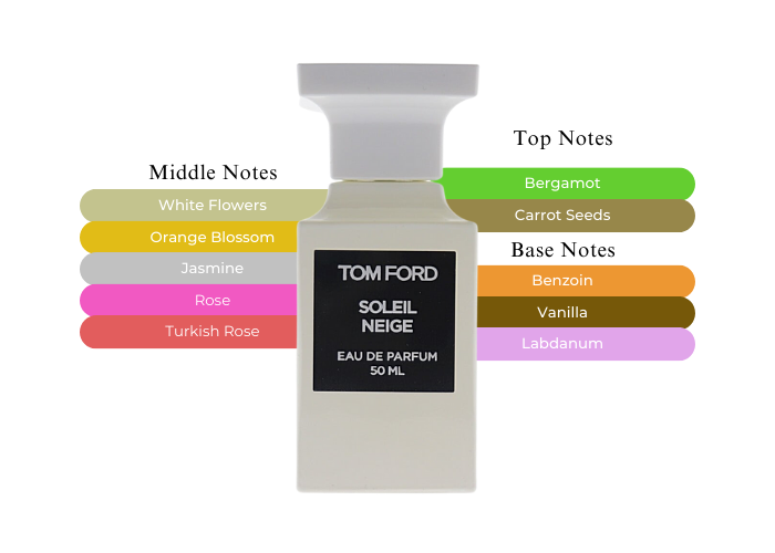 Tom Ford Soleil Neige (Snow Sun) is a delicate scent that begins with bergamot and carrot seeds. The middle notes are orange blossom, jasmine and ends with rose flower; base notes are vanilla and labdanum.