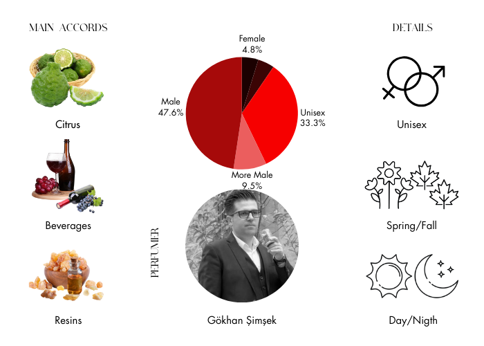 - Amber, Bergamot, Cedarwood, Frankincense, Grapefruit, Patchouli, Pink Pepper, Vetiver and Wine