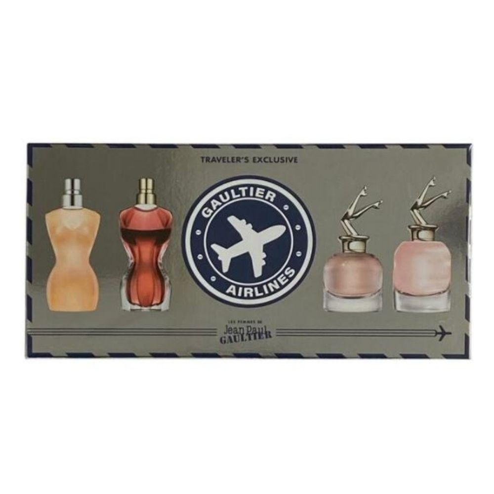 Jean Paul Gaultier Classique Travellers Exclusive Miniature Set containing a Jean Paul Gaultier Classique Eau de Toilette 6ml, a Jean Paul Gaultier La Belle Eau de Parfum 6ml, a Jean Paul Gaultier Scandal Eau de Parfum 6ml and a Jean Paul Gaultier Scandal a Paris Eau de Toilette 6ml.