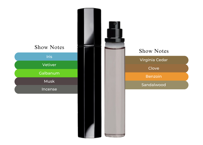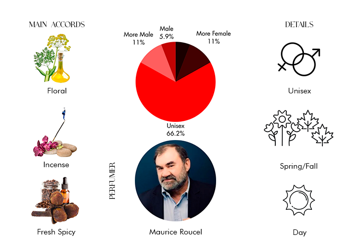 "Basic notes of the composition includes: orrisroot, galbanum, cedar, sandalwood, clove, vetiver, musk, Chinese benzoin, incese and white amber. Raw earthy iris emerges at the very beginning, surrounded by spices and green moss. "