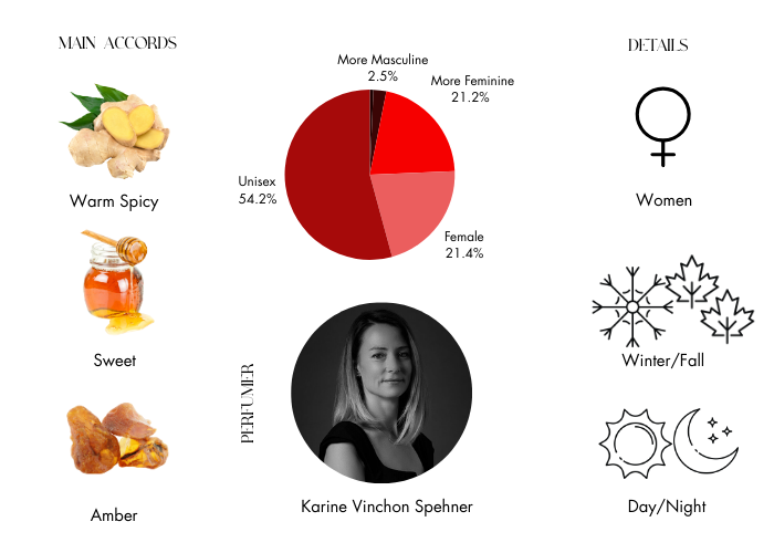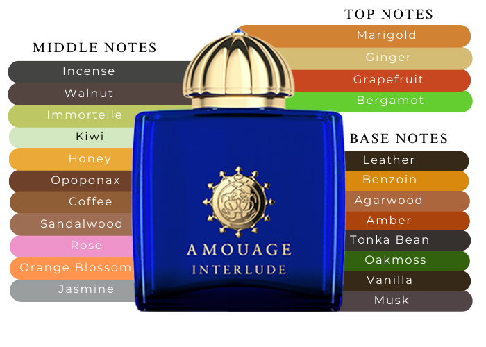 Fragrance notes are Bergamot, Grapefruit, Ginger, Marigold ,Incense, Rose, Orange blossom, Helichrysum, Jasmine ,Opoponax, Vanilla, Benzoin, Amber, Sandalwood, Oud, Oak moss, Leather, Tonka bean, Animalic notes, and Musk.
