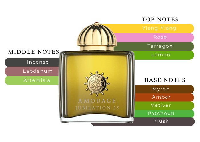 Fragrance notes are ylang-ylang, rose, tarragon and lemon; middle notes are labdanum, rose, artemisia and incense; base notes are amber, patchouli, musk, vetiver and myrrh.