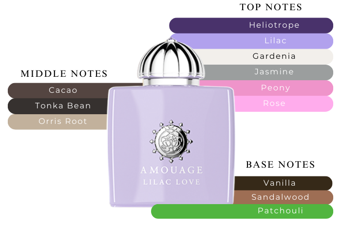 - Top Notes: Heliotrope, Lilac, Gardenia, Jasmine, Peony and Rose
