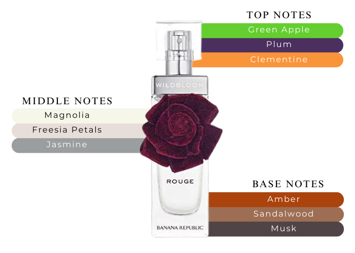 Top notes are green apple, clementine and plum; middle notes are magnolia, freesia petals and jasmine; base notes are amber, cashmere musk and sandalwood.