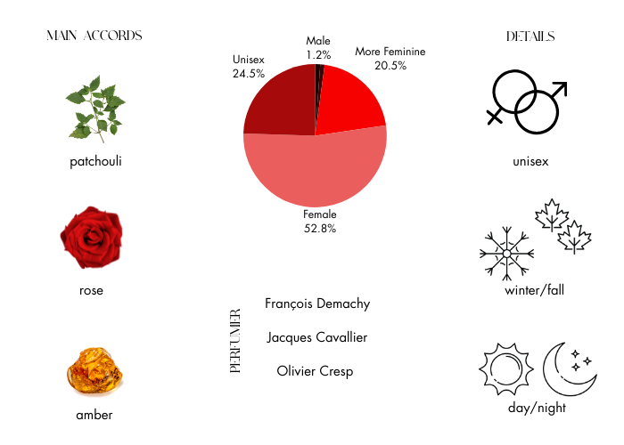 This fragrance is opening with citrus notes of mandarin and bergamot to the rose heart, and patchouli, amber and French vanilla in the base.