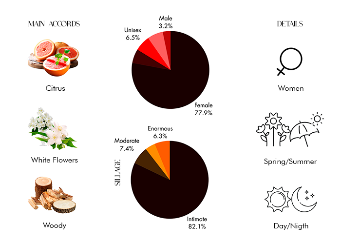 From woody notes to grapefruit, amber and musk, every spritz transports you to a world of pure delight and blissful moments. And as the scent lingers on your skin, the base notes of vanilla and musk underline your sensuality and leave a lasting trail of alluring beauty.