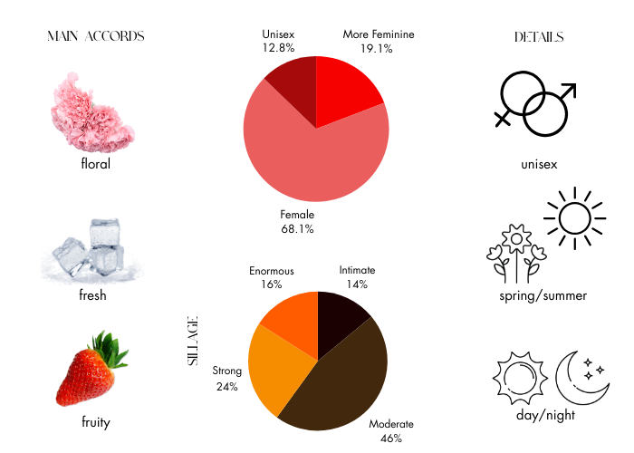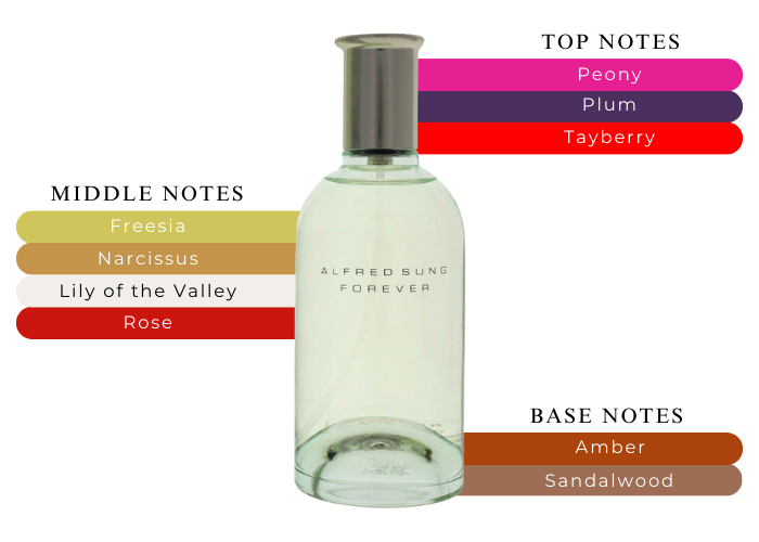 Top notes are Peony, Plum and Tayberry; middle notes are Freesia, Narcissus, Lily-of-the-Valley and Rose; base notes are Amber and Sandalwood.