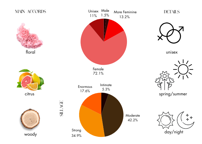 This fresh and floral fragrance is a blend of Orange, Mandarin, Bergamot, Lemon, Ylang-Ylang, Galbanum, and Hiacynth.