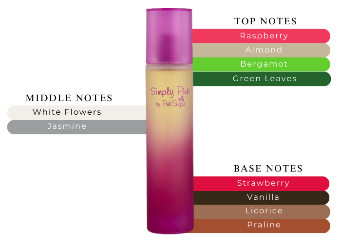 Features The fragrance opens in a fresh mood, with luminous bergamot sweetened with juicy wild strawberry Spiced with almonds and refreshed with green leaves, providing a sparkling feeling to the scent. The heart beats in a romantic rhythm of classic shades of various white flowers and intoxicating jasmine. The whole composition is rounded up with gourmand notes vanilla, licorice, pink praline and strawberry, ensuring the characteristic stamp of Pink Sugar collection.