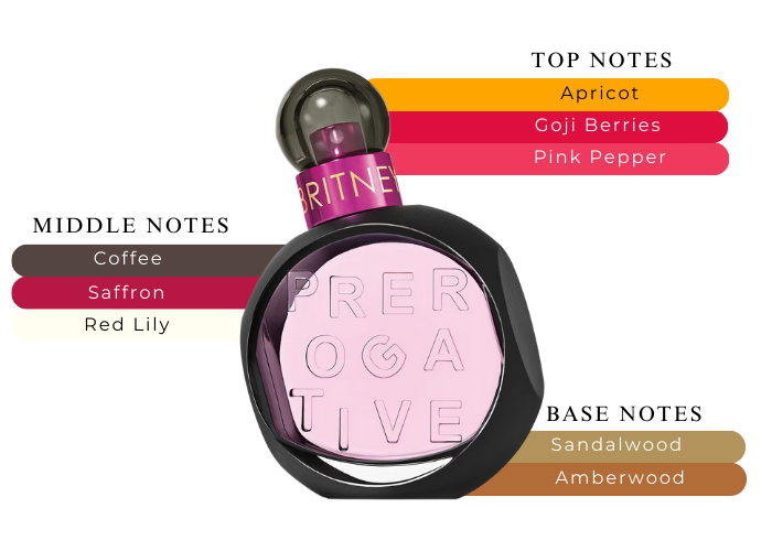 Britney Spears Prerogative Perfume by Britney Spears, Show everyone you're in charge of your own destiny when you're wearing Britney Spears Prerogative, a flirty women's fragrance. This intriguing perfume combines spicy, powdery and fruity accords for a rich and compelling scent that's a perfect olfactory tease to anyone nearby. Top notes of juicy apricot, tart Goji berries and bold pink pepper introduce the scent with a vibrant atmosphere, while middle notes of soft saffron cream, espresso foam and red calla lily lend an original touch that's entirely unique. Finally, the warm subtlety of amber wood and sandalwood complete the fragrance for an exotic and highly innovative perfume you won't want to miss.