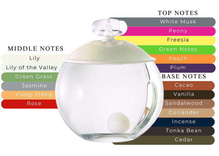 Tender powdery top notes of freesia, peach skin, peony and musk lead to floral heart of white flowers, ylang-ylang and rose. The base is woodsy transparent with coffee and incense touches.