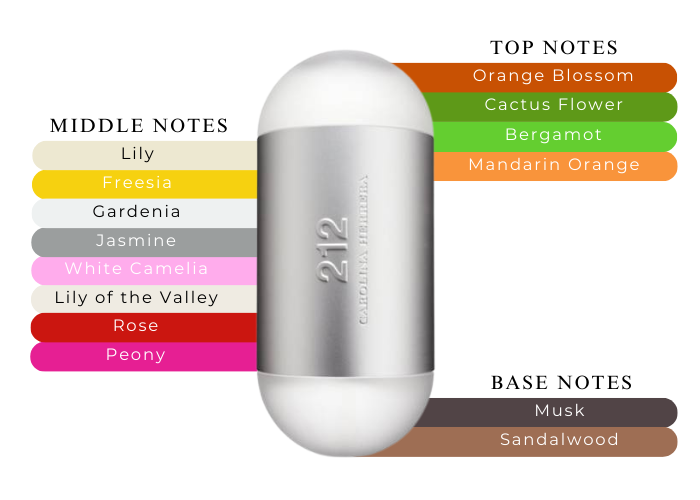 Carolina Herrera 212 NYC is a blend of sexy aromas like bergamot and flower stems. The heart is composed of gardenia and jasmine. Its base notes are made up of musk and sandalwood.