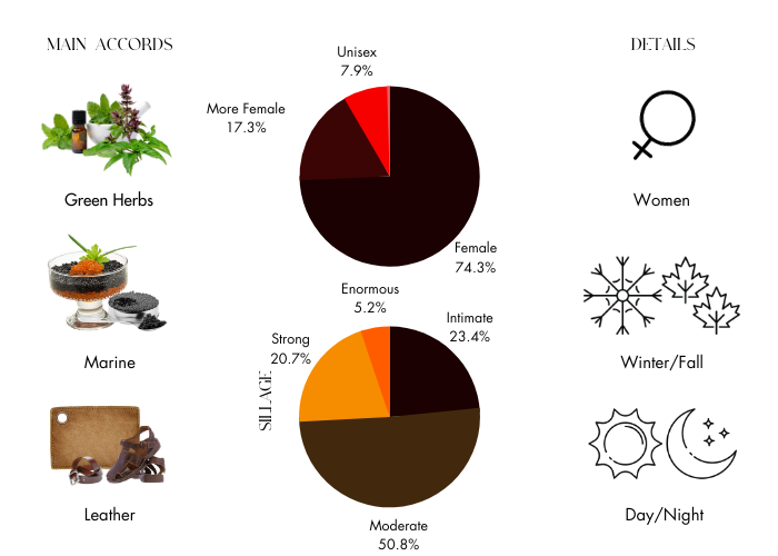 - Base Notes are Leather, Praline, Patchouli, Sandalwood, Cedar and Musk.