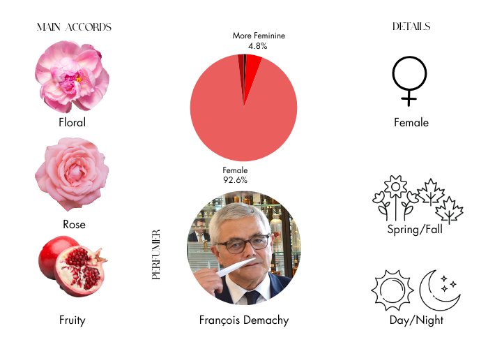 The composition is comprised of three layers: red berries, Centifolia May rose from Grasse and peony, as well as white musk.