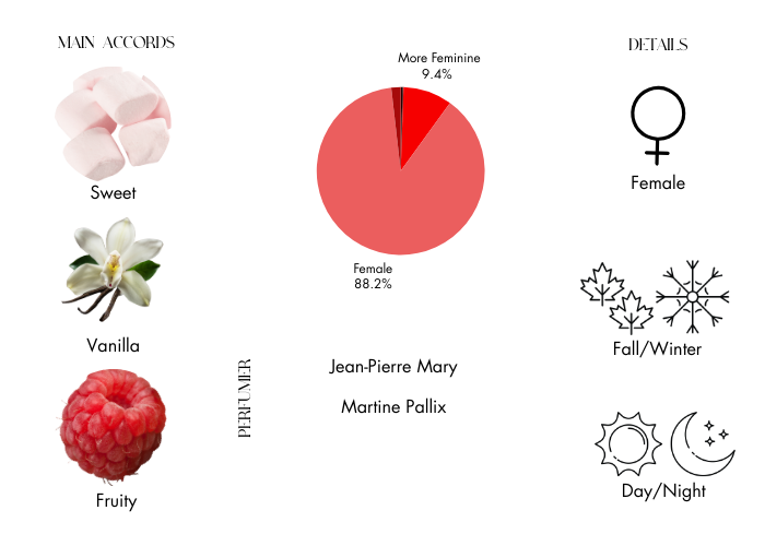 - Base Notes: Marshmallow, Vanilla, Heliotrope and Sandalwood