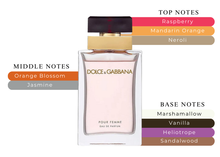 Dolce & Gabbana Pour Femme Perfume by Dolce & Gabbana, Dolce & Gabbana Pour Femme perfume was redesigned in 2012 to renew it after 2 decades of success. This new take on the fragrance is more contemporary for the modern day woman. It continues to produce an intensely floral effect, but offers a new twist. Pour Femme opens with notes of neroli, sweet tangerine and fruity raspberry. Middle notes of orange blossom and classic lavender precede this strong opening. The twist comes in at the end as marshmallow sweeps in alongside vanilla, heliotrope, and earthy sandalwood to finish it off. The bottle is sleek, straightforward, and intentionally feminine with blush and gold coloring in a simple glass container.