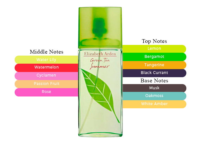 Green Tea Summer by Elizabeth Arden for Women , this citrusy and aquatic fragrance is a blend of Black Currant, Bergamot, Tangerine, and Lemon.