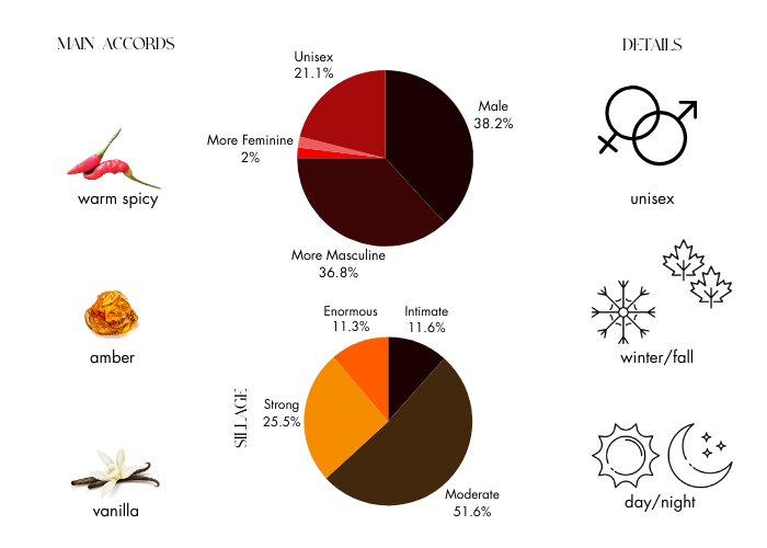 Top notes are Aldehydes, Coriander, Gardenia, Artemisia, Ylang-Ylang, Bergamot and Lily-of-the-Valley; middle notes are Spicy Notes, Sandalwood, Honey, Tuberose, Patchouli, Orris Root, Cedar, Heliotrope, Jasmine and Rose; base notes are Incense, Civet, Oakmoss, Leather, Sandalwood, Musk, Cedar, Vanilla and Coconut.