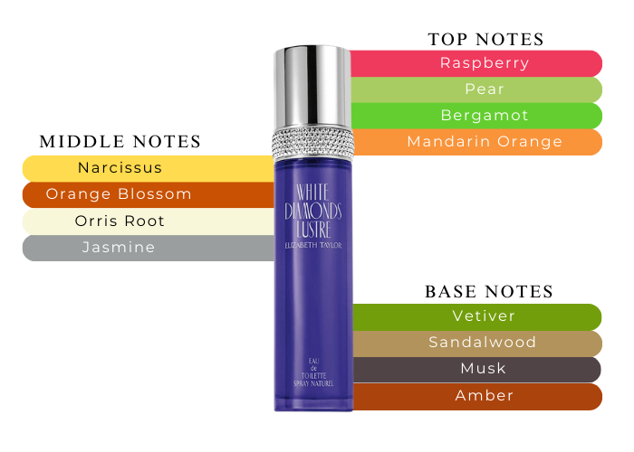 White Diamonds Lustre by Elizabeth Taylor Perfume. Launched in 2014, White Diamonds Lustre by Elizabeth Taylor is a fragrance for women who can never have too many diamonds. The fresh scent is feminine and fruity, with top notes of bergamot, mandarin orange, pear and raspberry. Its lower hints of narcissus round out the fragrance, keeping it from being too sweet. Slightly reminiscent of the original White Diamonds fragrance, this is an update for women who want a signature scent that won't be forgotten.