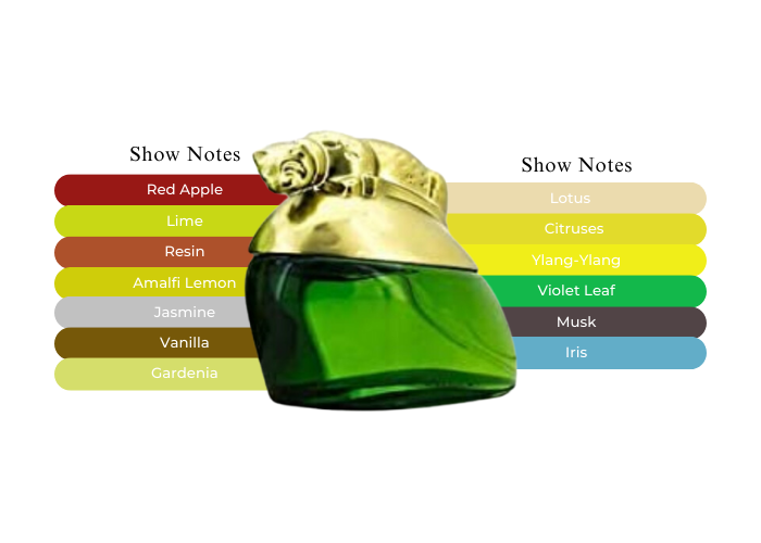 - Red Apple, Lime, Resin, Amalfi Lemon, Jasmine, Vanille, Gardenia, Lotus, Citruses, Ylang-Ylang, Violet Leaf, Musk and Iris