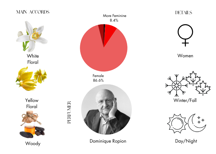 - Middle Notes: Tuberose, Ylang Ylang, Gardenia, Jasmine, Mimosa, Black Locust, Carnation, Cassia, Rose, Blackcurrant, Orchid and Red Berries