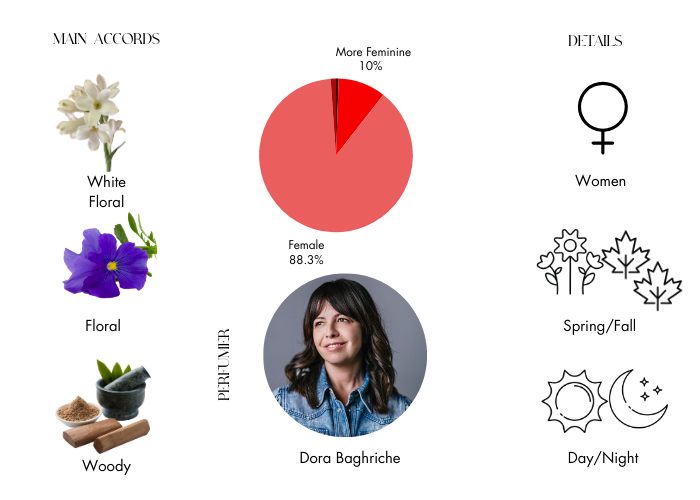 - Tuberose, Jasmine, Gardenia, Hyacinth, Sandalwood, Violet, Suede, White Lily and Woods