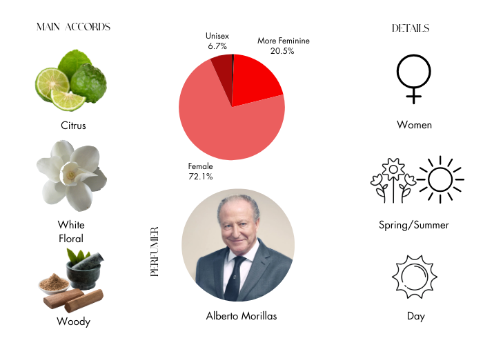 This stunningly fresh scent will instantly intrigue with its signature citrusy top notes, then capture your heart with its floral heart composed of jasmine, magnolia and a dash of rose. A powdery base comprised of sandalwood blends into this addictive floral aroma to leave you captivated and just enough to make you think you're walking through a garden filled with flowers.