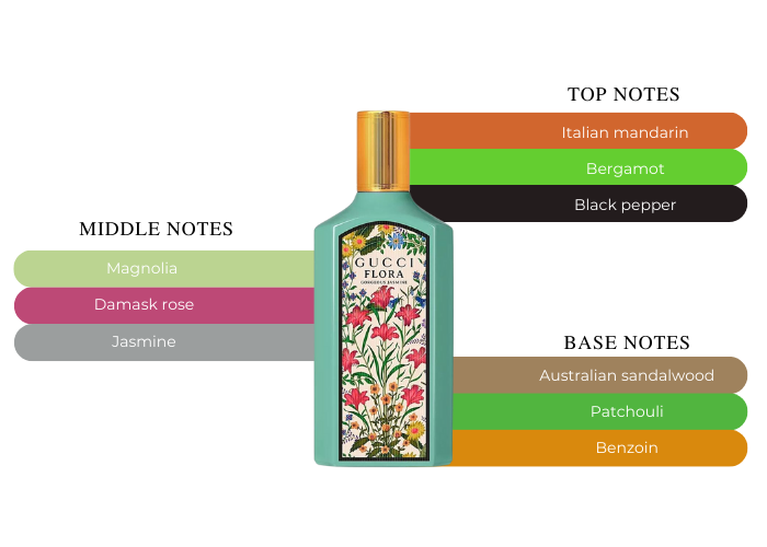 - Middle Notes: Jasmine, Jasmine Sambac, Magnolia and Damask Rose