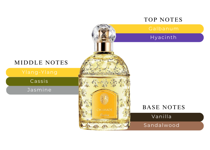 For the first time in perfumery, Guerlain introduced to a formula the green and fruity accent of blackcurrant bud, freshened with a green harmony of hyacinth. Lastly, this symphony is embellished with Guerlinade, which majestically showcases jasmine, vanilla and sandalwood.