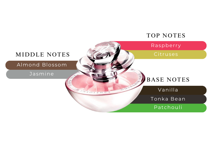 "Opening with a fresh, tangy raspberry note, the fragrance then delicately sinks into a floral heart of jasmine and almond tree flower. The base then takes over with the warm, sweet notes of vanilla, tonka bean and patchouli to enhance this essence of femininity."