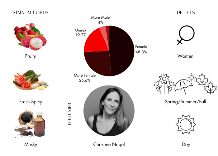 This alluring composition begins with the vivacious charm of juicy fruits, teasing your senses with bursts of freshness and vibrant energy. As the fragrance evolves, a bouquet of delicate florals takes center stage, gracefully intertwining to create a captivating harmony that evokes feelings of elegance and femininity. Finally, a sensual and sophisticated base of warm musk provides a solid foundation.