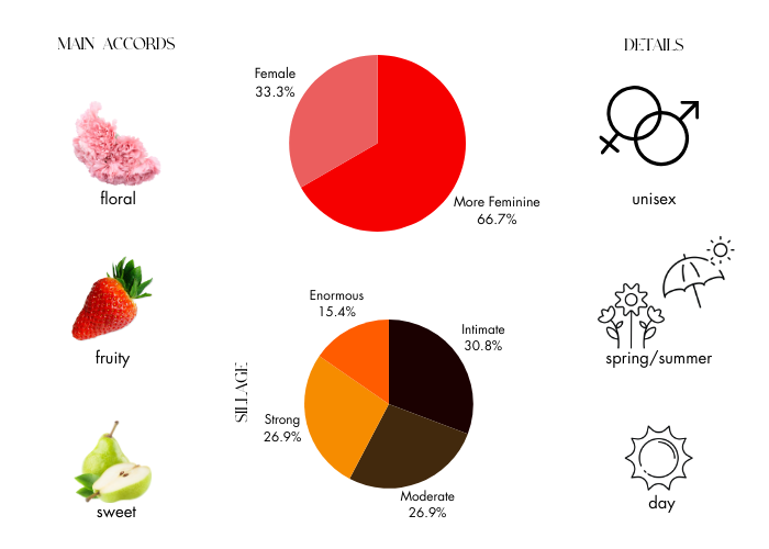DESCRIPTION Dominant notes of pear and peony give this fragrance a fresh fruity accord that makes summer sweeter. For an extra layer of depth, supporting floral notes, including rose, enter the scene and bolster the feeling of walking through a fragrant garden.
