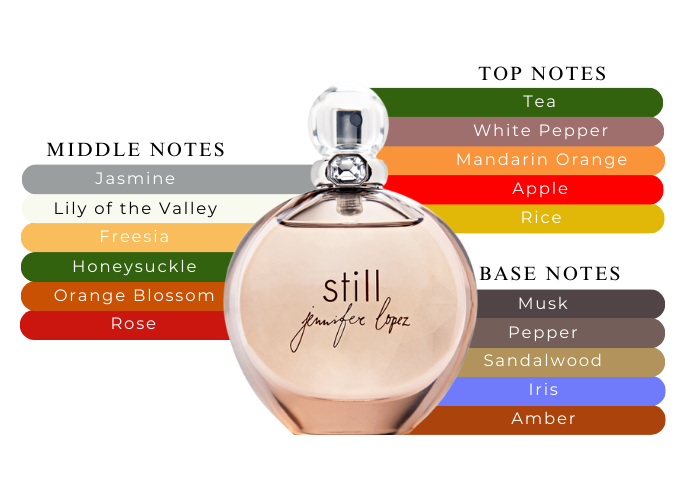 Launched by jennifer lopez in 2003. Still perfume by j. Lo is as sensual as sable over bare skin, as delicate as pink satin, and as refreshing as a first sip of champagne blending sake, white pepper, mandarin, earl grey, pink freesia, honeysuckle, orange flower, rose, wild jasmine, sandalwood, musks, ambers, and orris.