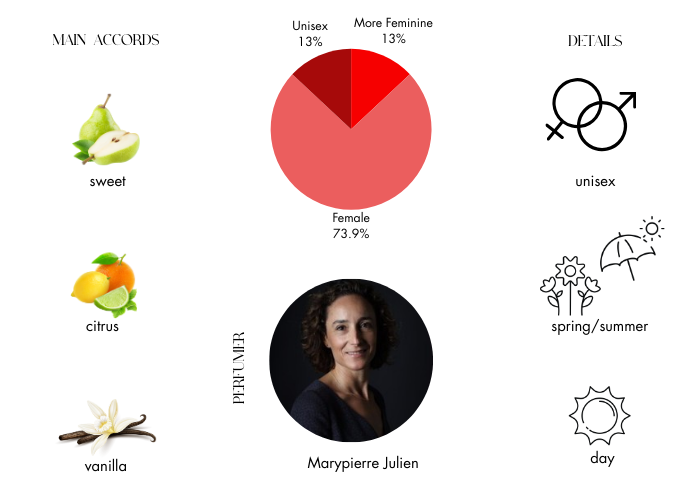 It opens with accords of clementine, nectarine and plum. The heart includes tiger lily and star fruit, placed on the base of white chocolate and sandalwood.