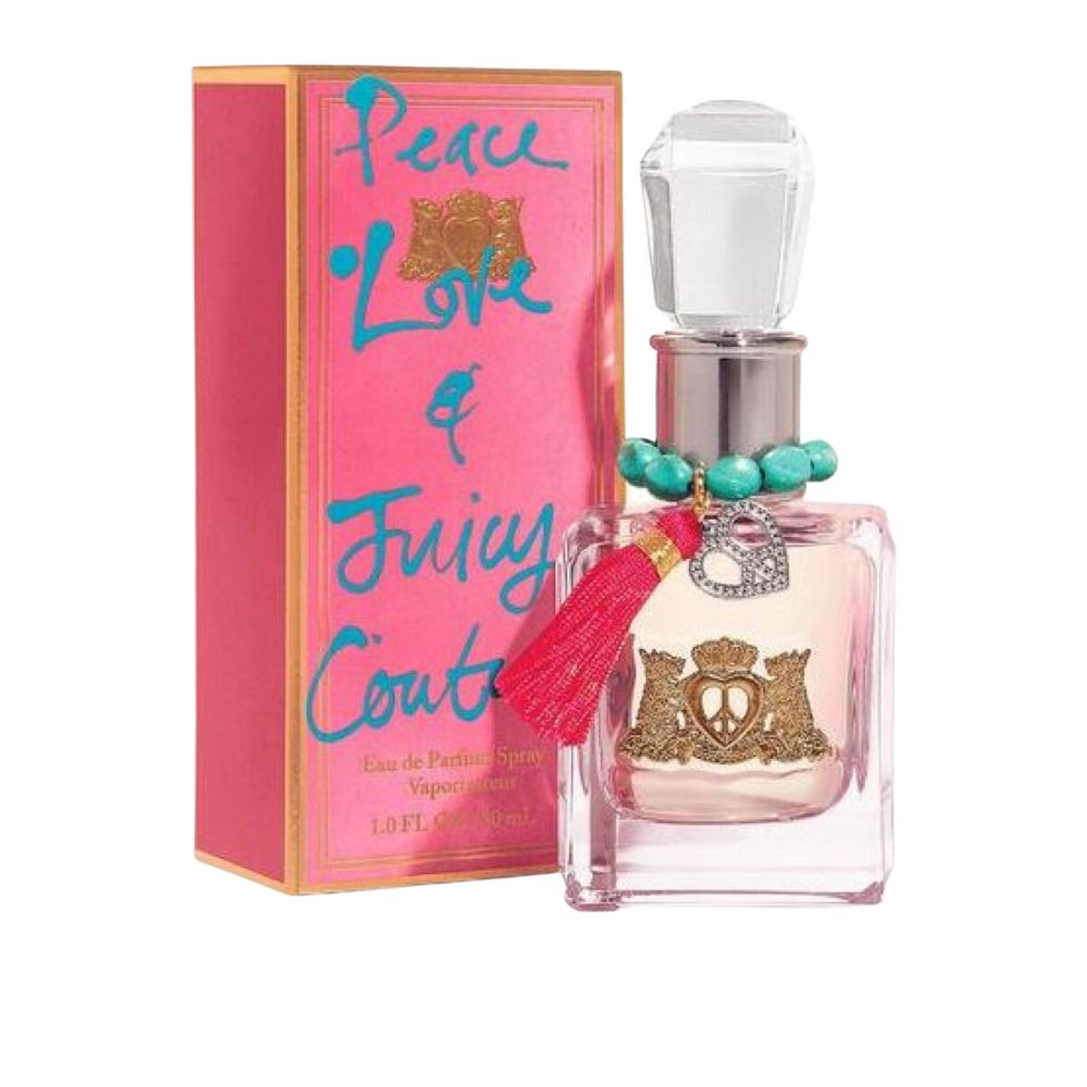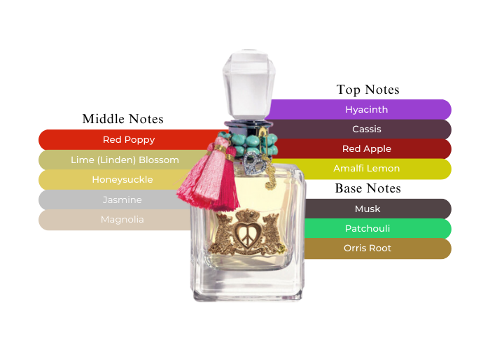 Peace Love & Juicy Couture Perfume by Juicy Couture, Peace Love & Juicy Couture is a fruity, floral, feminine perfume that was introduced in 2010. The top notes are tantalizing and consist of Meyer lemon, apple, hyacinth and blackcurrant. The heart notes balance out the fruits with star magnolia, sambac jasmine, linden blossom, honeysuckle and poppy. The base notes complete the scent and are musk, iris and patchouli. The packaging is vibrant and fun. The box is bright pink with the name of the fragrance in turquoise writing. The glass bottle and ornate top are adorned with a charm bracelet, made with beads and tassels in the same colors as the box, and a heart shaped charm designed to look like the peace sign.