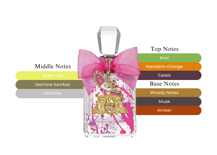 Top notes of mandarin, kiwi and cassis greet you at first spritz. Luscious water lily and two types of jasmine comprise the floral heart accord. A sultry base of amber, woods and musk will invite those around you to lean in closer.