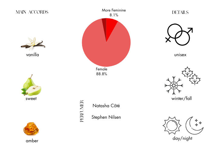 Fragrance notes are Tahitian vanilla orchid, sweet white peony, fresh and crisp apple, musk, Madagascar bourbon vanilla, luminous jasmine petals, soft and whipped fluffy musk, Mexican vanilla bean absolute and glowing amber.