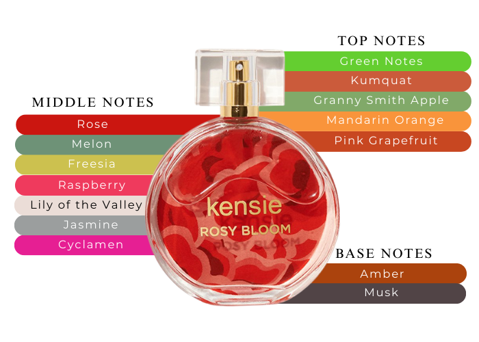 Kensie Rosy Bloom's perfume notes inspire you to be your true self, and let yourself bloom. This fine fragrance blend is a gorgeously choreographed blend of fresh fruit and blooming florals