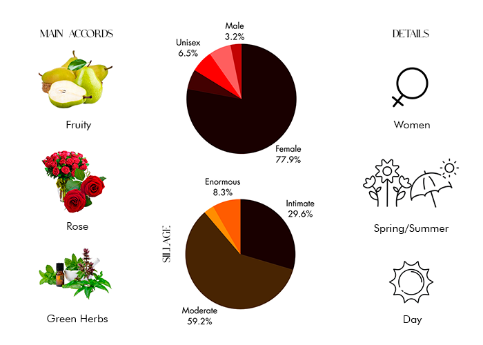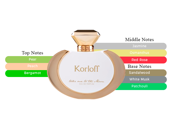 Fragrance notes are Pear, Bergamot, Peach,Jasmine, Osmanthus, Red rose, Sandalwood, Patchouli, and White musk.