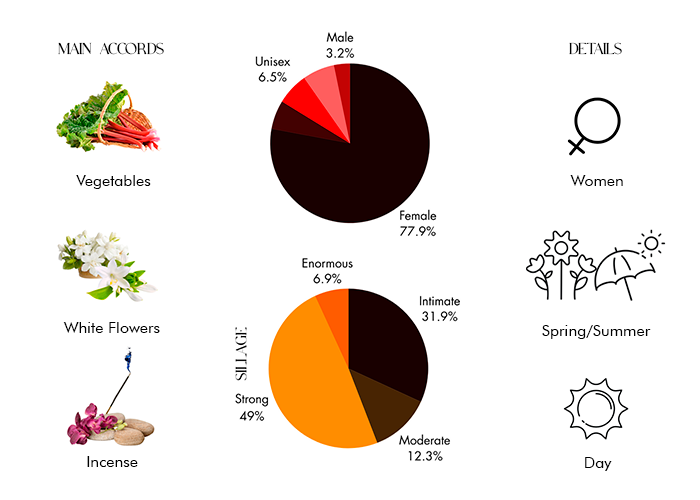Top notes are ylang-ylang, orange blossom and rhubarb; middle notes are tuberose, jasmine and gardenia; base notes are incense, musk and patchouli.