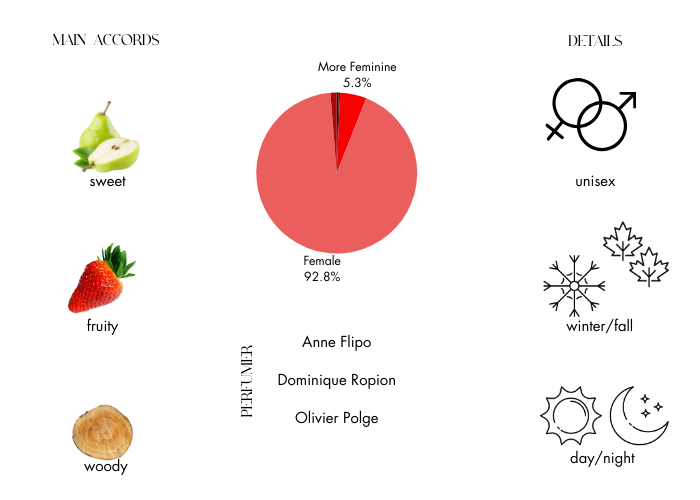 Iris is the key ingredient of the perfume, surrounded by orange blossoms and jasmine in the heart. The composition’s opening provides fruity flavors of black currant and pear, while the base is warm, gourmand and powdery due to almond-like accords of tonka bean, praline, patchouli and vanilla.