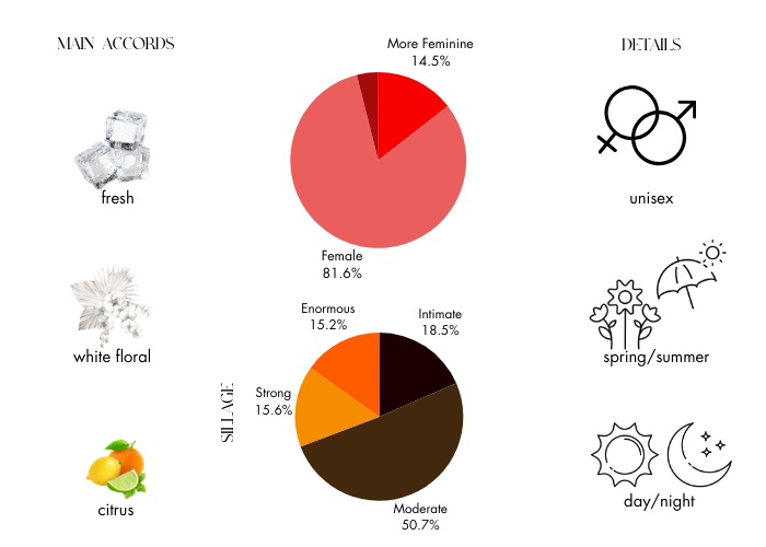 Fragrance notes are Citrus complex, pink pepper, cassis bud, violet, muguet, mimosa, vetyver, vanilla, and heliotrope.