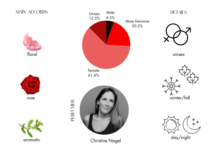 Fragrance notes are Bergamot, Freesia, Ambrette, Osmanthus, Rose, Vetiver.